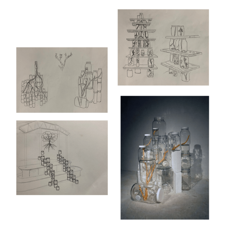 We wanted to add more magical colors to the project, and we got some inspiration from these pictures, so we designed some schemes for branches and glass and copper pipes.However, in the later operation, we did encounter some difficulties, such as the cost of buying glass cans is too large, but the production is very complicated.So we got rid of the glass jar and the real tree branch, and only kept the copper pipe. We wanted to use the copper tube to make the shape of the branch, to get close to the original design concept.