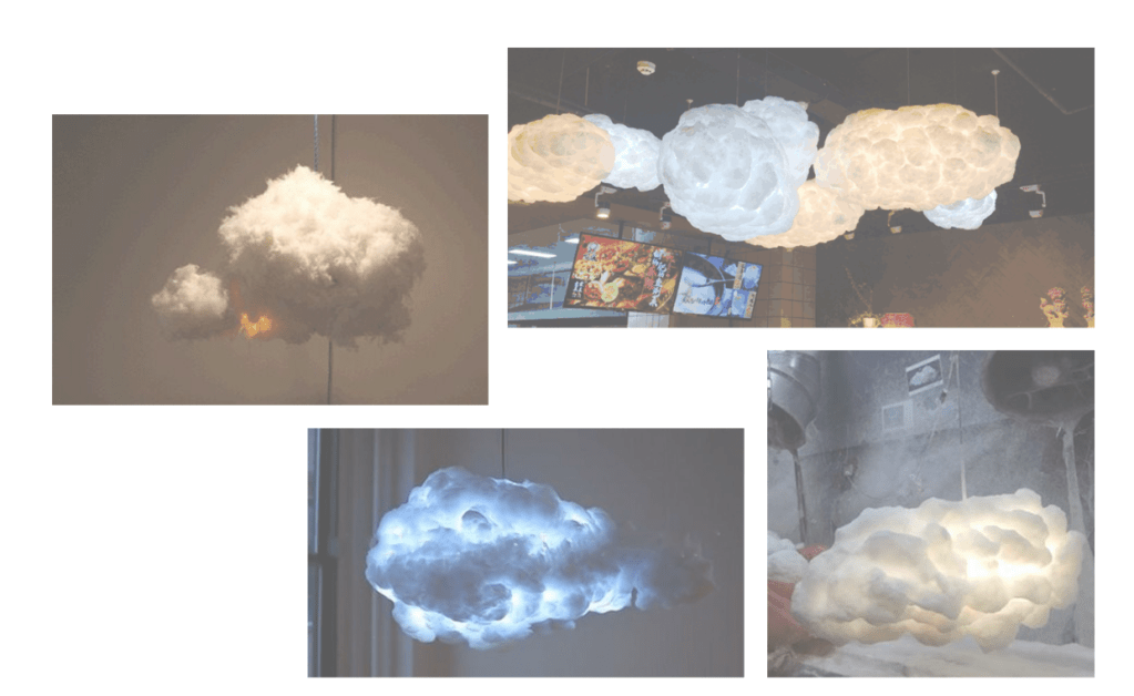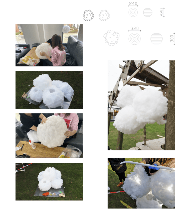 We made a total of seven clouds, and when we finished, we started to try to hang them on the forest table, and we changed a lot of arrangements to make them feel like they were scattered.