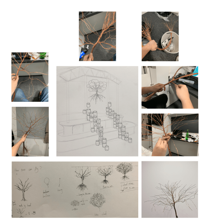 This is a 3D version of the design that combines all the ideas, including clouds, a wire cloud tree floating in the air and a copper tube branch in a glass jar.This is our initial ideal, and also our expected effect of the project at the beginning.