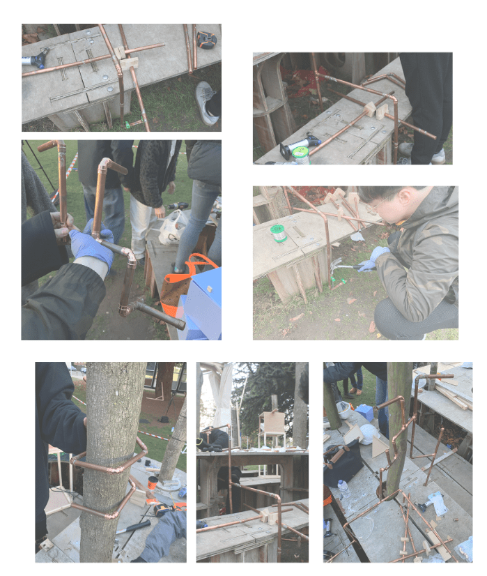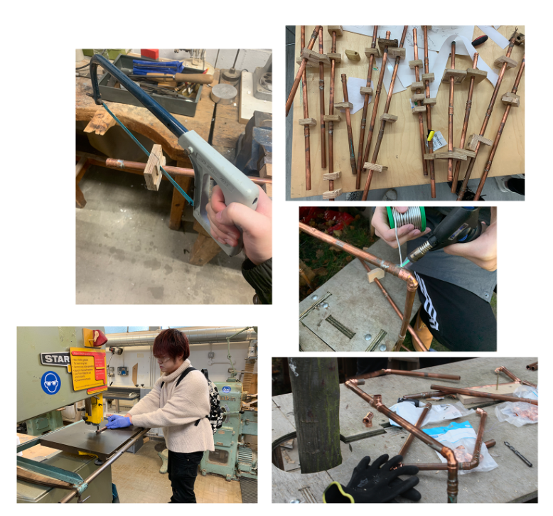 We began to dispose of the copper pipes, which were collected from the school and were considered a waste product.It took a lot of time and effort to remove the wood outside the copper pipe with a saw, and the boys were very careful to contribute their efforts.Later, when we were assembling the copper pipes, we again encountered a very difficult problem — we could not fix the connection between the two copper pipes. We tried many methods, such as using hot melt adhesive, using high temperature heating wire welding and so on.